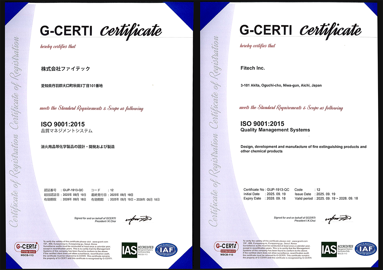 当社はこれまで、「ファイテック投てき用消火用具」をはじめ、森林火災対策用消火剤「Forest Defender」など、独自の発想と技術による革新的な防災ソリューションを開発・提供してまいりました。今回の認証取得を機に、研究開発から製造・販売・アフターサポートまでの全プロセスで品質マネジメントを一層強化し、社会から信頼される企業としてさらなる成長を目指します。